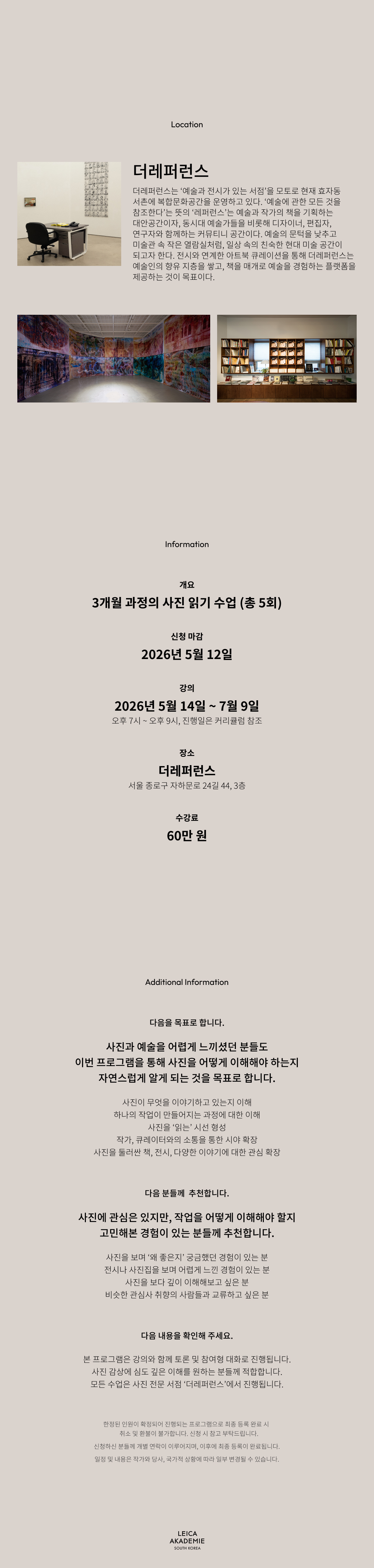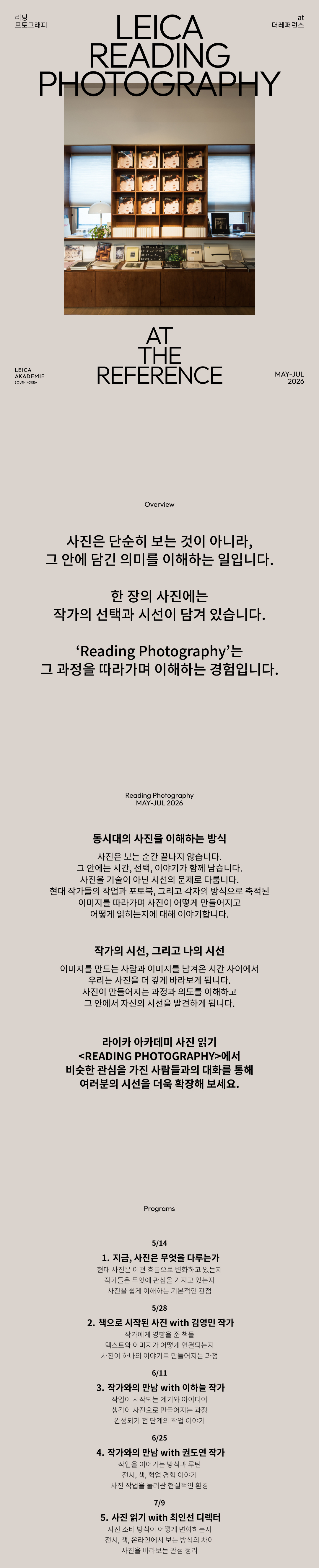 라이카 리딩 포토그래피는현대 작가들의 작업과 포토북, 그리고각자의 방식으로 축적된 이미지를 따라가며사진이 어떻게 만들어지고어떻게 읽히는지에 대해 이야기합니다.강연장을 벗어나 복합문화공간 '더레퍼런스'에서 진행되며,작가, 큐레이터와의 소통을 통해 사진과 예술을 바라보는 시야를 확장해 보세요.
